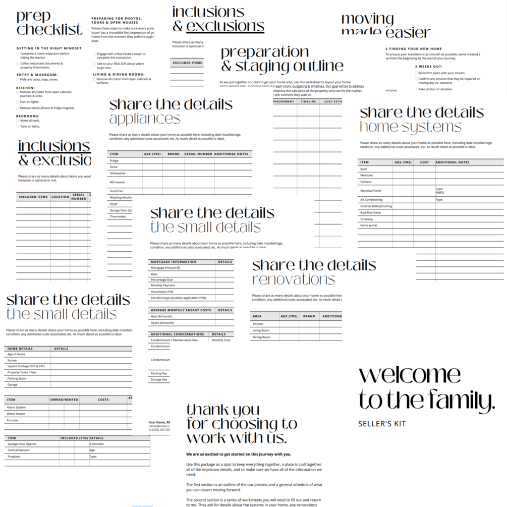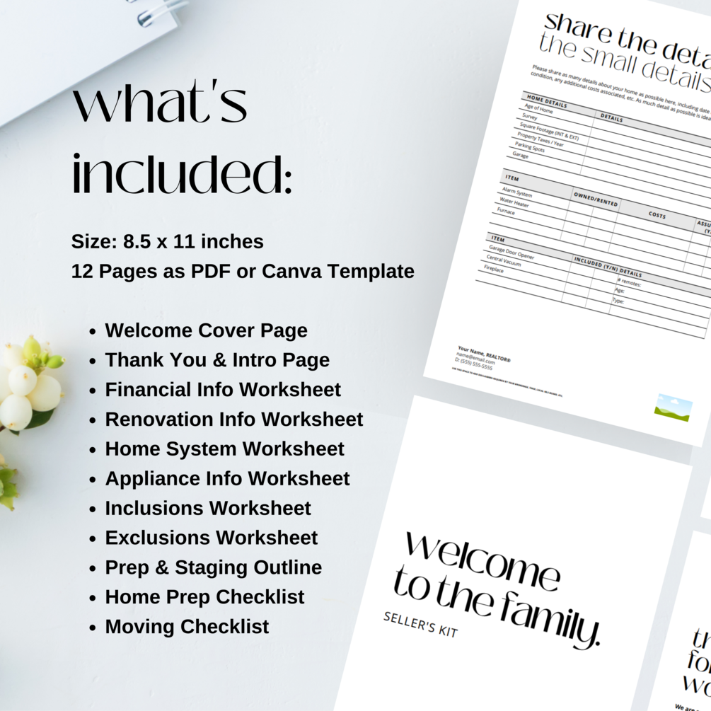 12 Pages as PDF or Canva Template with >Welcome Cover Page >Thank You & Intro Page >Financial Info Worksheet >Renovation Info Worksheet >Home System Worksheet >Appliance Info Worksheet >Inclusions Worksheet >Exclusions Worksheet >Prep & Staging Outline >Home Prep Checklist >Moving Checklist
